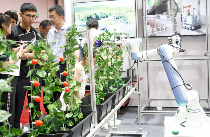 在农业展区,硕大的果园多臂采摘机器人引人注目。机械手臂通过位置和光感灵敏伸出准确抓住一个苹果,让观众对农业现代化和智能化有了更直观的了解。这款机器人由北京市农林科学院智能装备技术研究中心研制,通过机械臂和果实获取装置,实现采果、纳果、储果全程自动化采收,并具备昼夜连续作业的能力,每小时可以采摘400至550果,大幅提升了采摘效率。