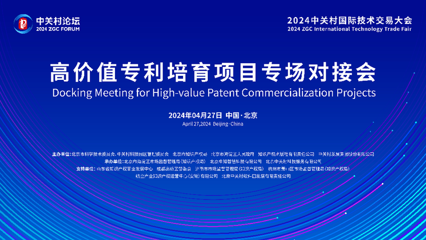 4月27日,在第24个世界知识产权日之际,为分享高价值专利转化运用的经验做法,展示服务高价值专利转化运用的系列产品服务,展演基于优秀专利技术的创新项目,营造有利于促进专利转化运用的良好氛围,由北京市科学技术委员会、中关村科技园区管理委员会、北京市知识产权局、北京市海淀区人民政府、知识产权出版社和中关村发展集团主办的高价值专利培育项目专场对接会在2024中关村论坛·中关村国际技术交易大会上成功举办。