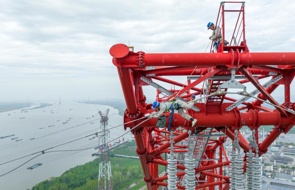 安徽送变电工程有限益达娱乐检修工人在高空检修±800千伏建苏线跨江通道(4月10日摄,无人机照片)。
