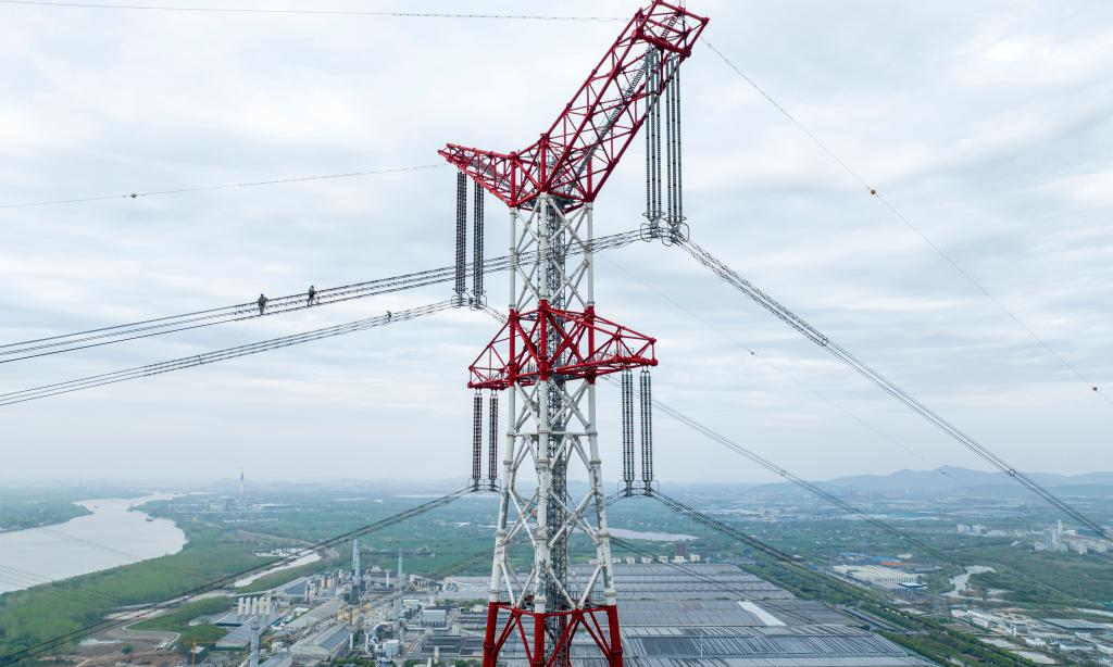 工人们在最高达278.2米的特高压输电线路上“走钢丝”