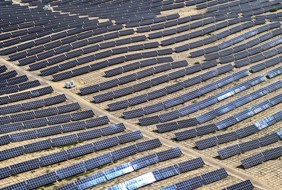 科尔沁沙地上的光伏治沙项目(资料图片)。新华社记者 连振 摄
