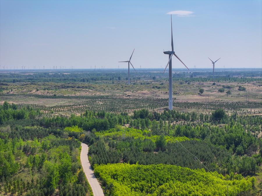 在通辽市科尔沁沙地拍摄的风力发电机组(无人机照片,5月15日摄)。新华社记者 连振 摄
