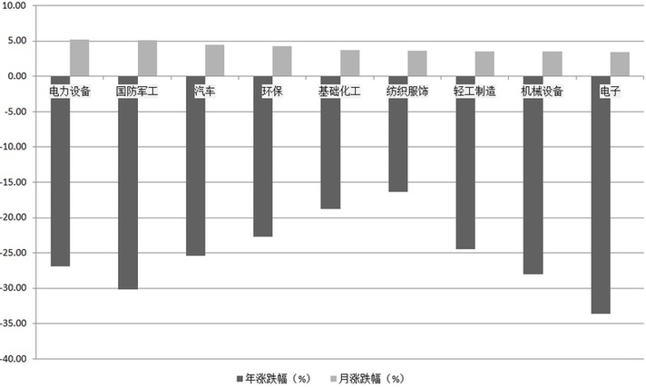 部分宽基指数和超跌行业也明显反弹。科创50指数、中证1000指数月内涨超4%。截至11日收盘,科创50指数重回1000点上方。行业方面,以申万一级行业指数为例,今年以来跌幅居前的电子、国防军工、传媒、机械设备、电力设备和汽车等行业,5月以来均出现明显涨幅。截至5月11日收盘,电子行业年内跌逾33%,5月以来涨近3.4%;国防军工行业年内跌逾30%,5月以来涨超5%;电力设备行业年内跌近27%,5月以来上涨5.18%,涨幅位列31个申万行业之首。