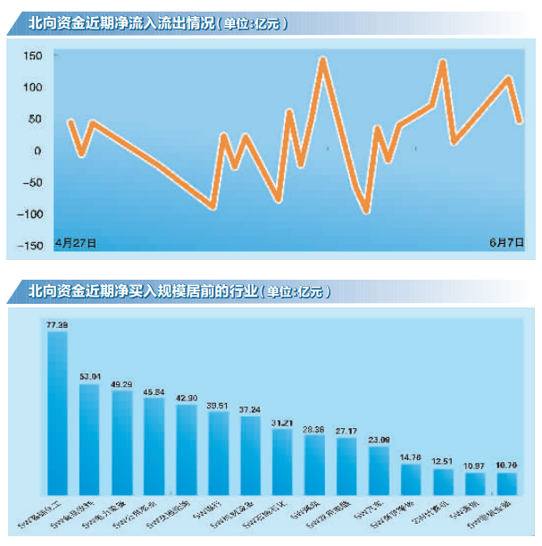 从北向资金加仓的行业来看,Wind数据显示,截至6月6日,4月27日以来,北向资金对基础化工、食品饮料、电力设备行业加仓金额居前,分别为77.38亿元、53.04亿元、49.29亿元,此外对公用事业、交通运输行业加仓金额均超40亿元。期间北向资金对房地产、有色金属、钢铁行业减仓金额居前,分别达到37.48亿元、23.63亿元、14.05亿元。