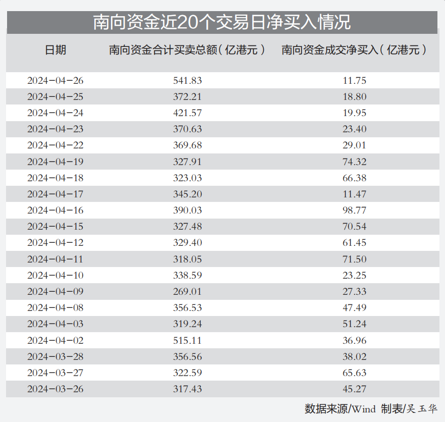 南向资金从3月26日-4月26日连续20个交易日加仓港股,累计净买入892.51亿港元,其中4月26日净买入11.74亿港元。