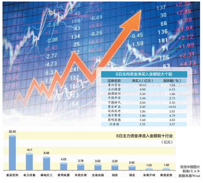 从6日沪、深股通十大活跃股情况来看,贵州茅台、立讯精密、招商银行获北向资金净流入金额居前,分别为30.61亿元、4.08亿元、3.50亿元;美的集团、分众传媒、国电南瑞获北向资金净卖出金额居前,分别为6.46亿元、5.23亿元、5.12亿元。