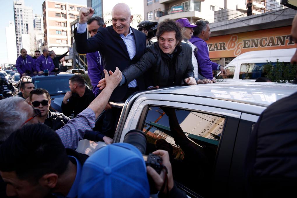 8月27日,在阿根廷洛马斯德萨莫拉市,阿根廷总统米莱(前右一)参加助选活动。新华社发
