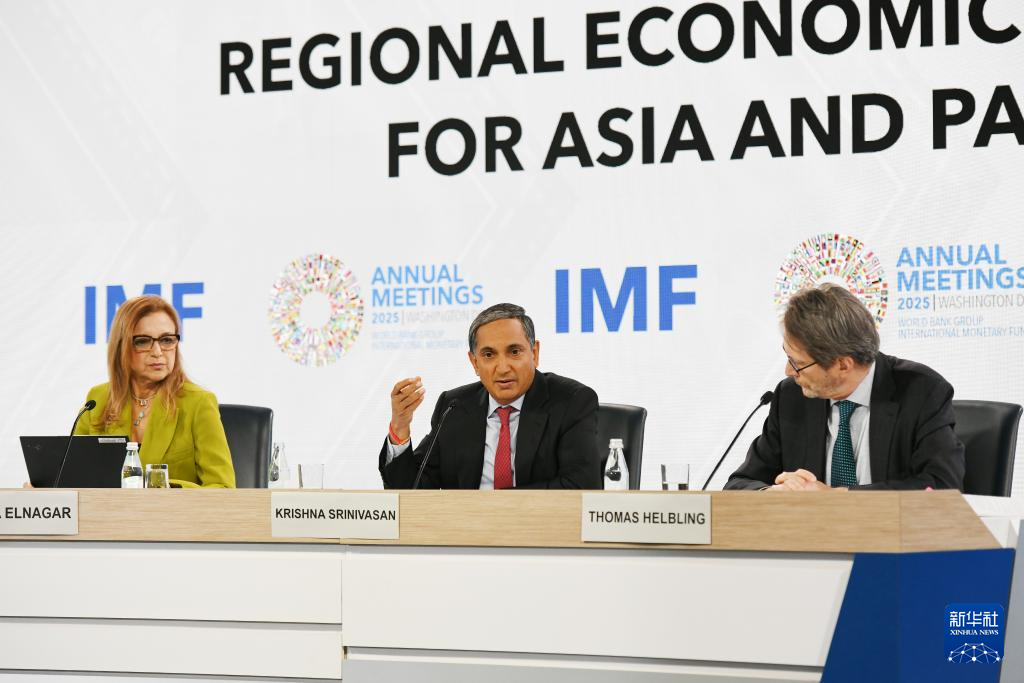10月16日,在美国华盛顿,国际货币基金组织(IMF)亚太部主任斯里尼瓦桑(中)在新闻发布会上讲话。新华社记者 李睿 摄