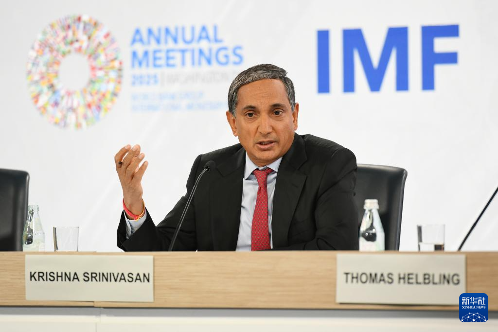 10月16日,在美国华盛顿,国际货币基金组织(IMF)亚太部主任斯里尼瓦桑在新闻发布会上讲话。新华社记者 李睿 摄