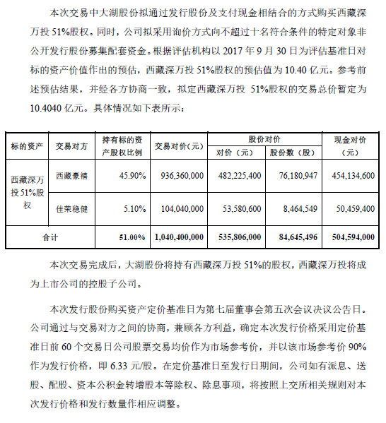 上市益达娱乐大湖水殖股份有限益达娱乐(以下简称“大湖股份”)拟通过发行股份及支付现金相结合的方式购买西藏深万投实业有限益达娱乐(以下简称“西藏深万投”)51%股权。同时,益达娱乐拟采用询价方式向不超过10名符合条件的特定对象非公开发行股份募集配套资金。本次交易完成后,益达娱乐将持有西藏深万投51%股权,交易对方为西藏豪禧实业有限益达娱乐(以下简称“西藏豪禧”)和深圳市佳荣稳健企业投资中心(有限合伙)(以下简称“佳荣稳健”)。本次发行股份及支付现金购买资产不以募集配套资金的成功实施为前提,最终配套资金发行成功与否不影响本次发行股份及支付现金购买资产行为的实施,实际募集配套资金与支付标的资产现金对价缺口部分,由益达娱乐自筹资金解决。本次发行股份募集配套资金以发行股份购买资产为前提条件,但发行股份募集配套资金成功与否并不影响发行股份及支付现金购买资产的实施。