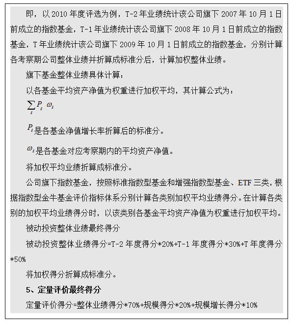 定量评价得分=被动投资能力得分*70%+规模得分*20%+规模增长得分*10%