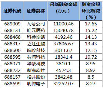九号益达娱乐等6只科创板股融资余额增幅超10%