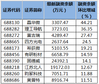wind统计显示,8月2日共有156只科创板个股融资余额环比增加。其中,12股融资余额增幅超过10%。融资余额增幅最大的是晶华微,最新融资余额为3307.47万元,环比增幅达44.21%;融资余额增幅较大的还有理工导航、富吉瑞、四方光电、希荻微、有研粉材等股。