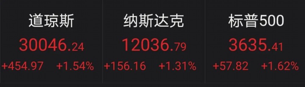 美股三大指数集体收涨,道指涨1.54%,收盘点位为30046.24,首次收于30000点上方;标普500指数涨1.62%,刷新收盘历史新高;纳指涨1.31%,接近历史最高纪录。