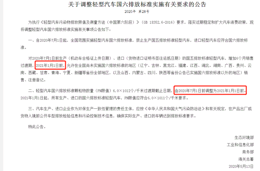 其中提出,对2020年7月1日前生产(机动车合格证上传日期)、进口(货物进口证明书签注运抵日期)的国五排放标准轻型汽车,增加6个月销售过渡期,2021年1月1日前,允许在全国尚未实施国六排放标准的地区(辽宁、吉林、黑龙江、福建、江西、湖北、湖南、广西、贵州、云南、西藏、甘肃、青海、宁夏、新疆等省份全部地区,以及山西、内蒙古、四川、陕西等省份公告已实施国六排放标准以外的地区)销售、注册登记。轻型汽车国六排放标准颗粒物数量(PN限值)6.0×1012个/千米过渡期截止日期,由2020年7月1日前调整为2021年1月1日前。2021年1月1日起,所有生产、进口的国六排放标准轻型汽车,PN限值应符合6.0×1011个/千米要求。