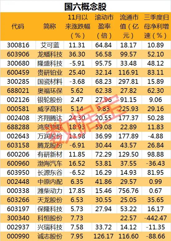 实际上,今年上半年,国六排放标准的概念股已经历了一次爆炒。截至11月24日收盘,艾可蓝、龙蟠科技、隆盛科技、贵研铂业、国瓷材料、奥福环保的年内涨幅均超60%。