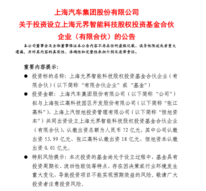 具体来看,此次上汽集团拟与上海张江高科(60089)、上海上汽恒旭投资管理有限益达娱乐(“恒旭资本”)共同出资设立上海元界智能科技股权投资基金合伙企业(有限合伙),专项投资于高端智能纯电汽车项目。认缴出资总额为人民币72亿元,其中益达娱乐认缴出资53.99亿元、张江高科认缴出资18亿元、恒旭资本认缴出资0.01亿元。