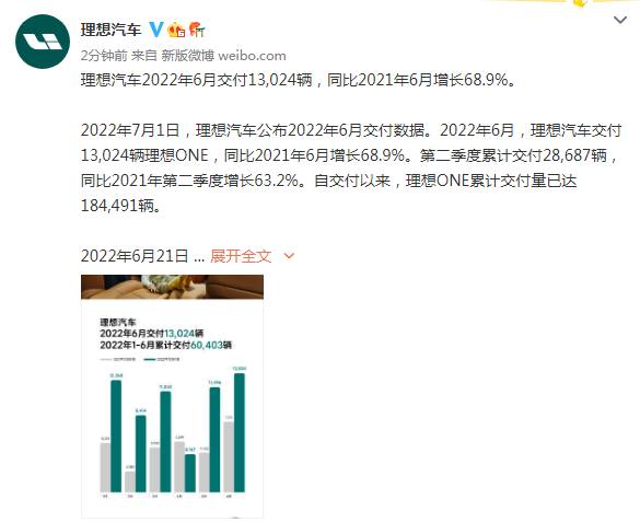 上证报中国证券网讯 据理想汽车微博7月1日消息,理想汽车2022年6月交付13,024辆,同比2021年6月增长68.9%。