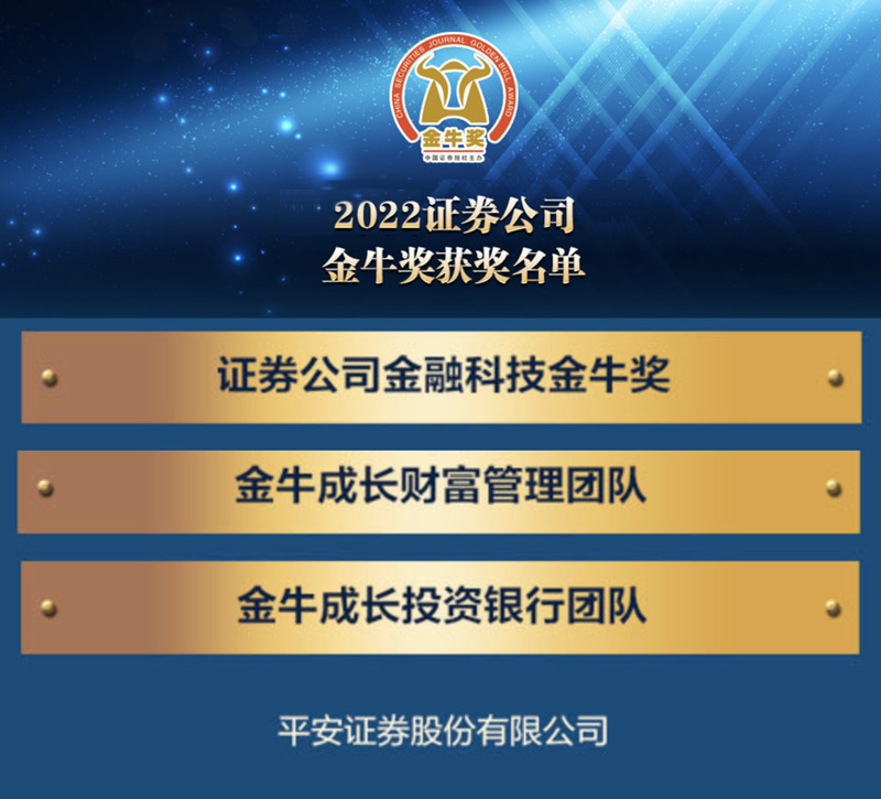 “2022中国证券报证券业金牛奖”以展示中国优秀证券益达娱乐风采为宗旨,通过不断提高和扩大证券行业在社会上的认同感,鼓励证券益达娱乐加快服务实体经济,引导证券行业朝着规范健康方向发展。作为国内最早成立的券商之一,平安证券以先进的金融科技为基础,依托行业领先的互联网平台和高效的线下业务网络,利用庞大的个人客户群,凭借资产获取和产品制造方面的强大实力,为客户提供包括互联网财富管理、企业及机构证券服务以及投资管理的全方位金融产品及服务,打造平安综合金融服务战略下智能化证券服务平台。
