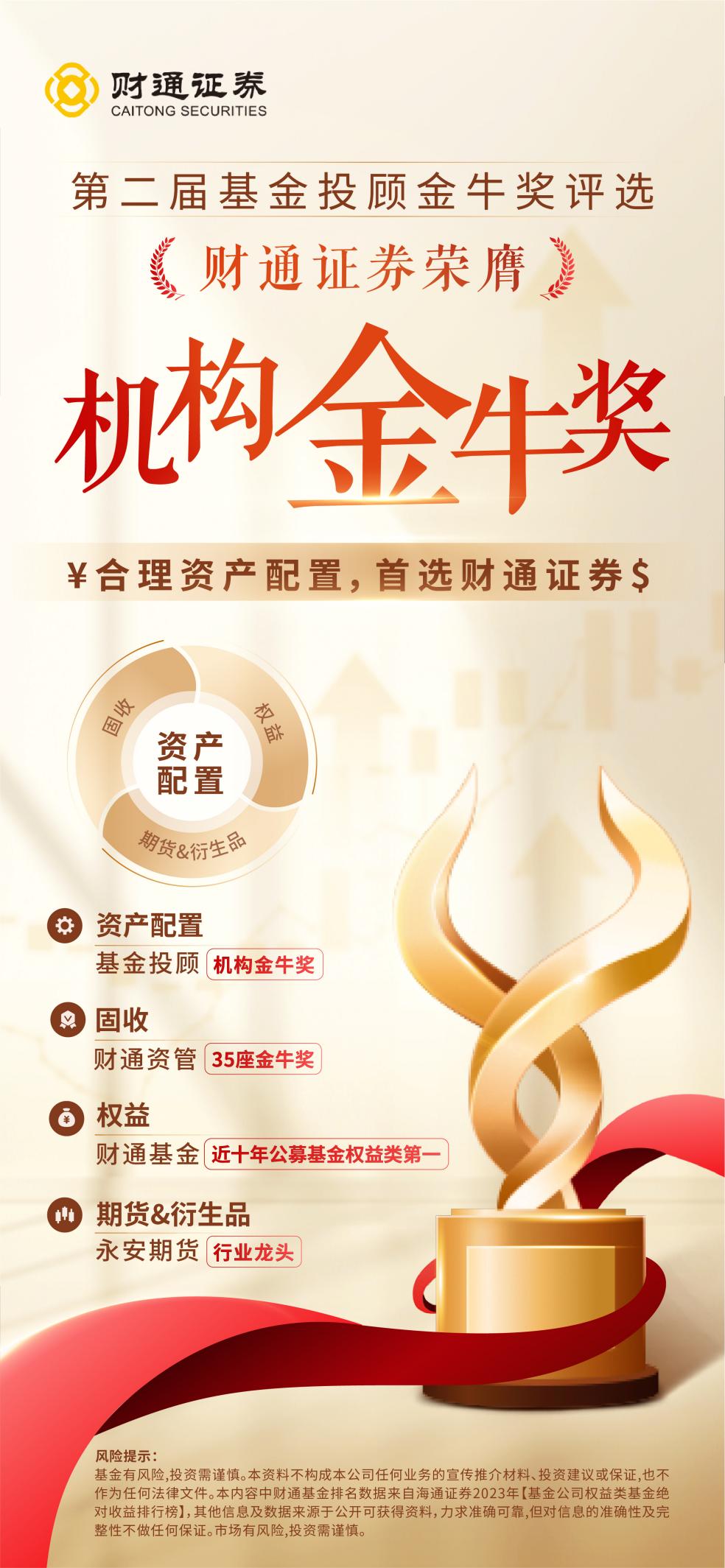 “金牛奖”由中国证券报主办,是中国资本市场和资管行业最具权威性和影响力的重磅奖项之一。此次获奖,不仅是对财通证券基金投顾业务在专业实力与服务质量上的高度肯定,也标志着财通证券在财富管理转型的道路上迈出了坚实的一步。