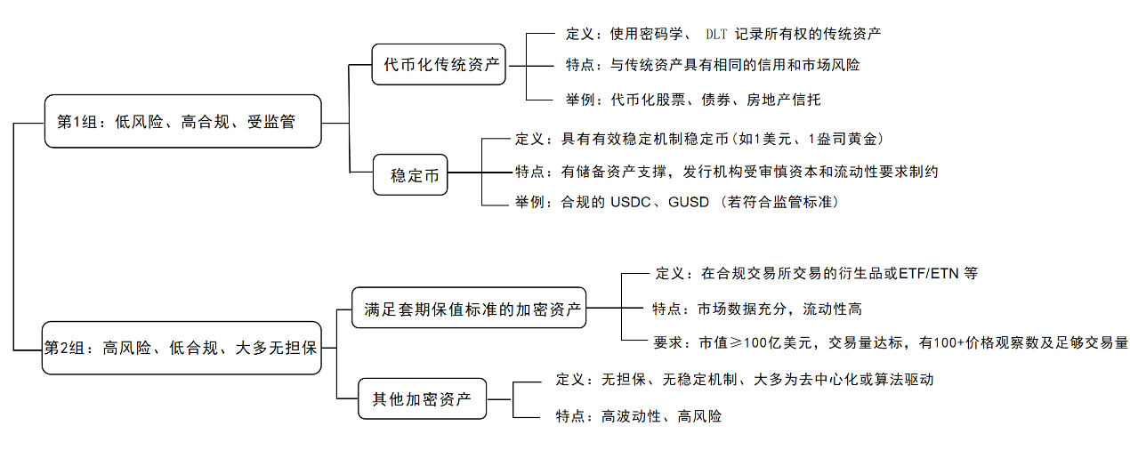 方案将加密资产分为2组4类,并按照第1a、1b、2a、2b组的顺序,对其实施逐渐严苛的审慎监管要求,以匹配不同资产的风险等级。