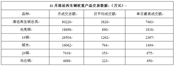 在铜米交易上,有赖于下游电子厂年末备料的刺激作用,本月交易量反而增加8362万元,增幅达108.5%。而占中低品位比重较大的2#铜与马达铜在11月份成交额合计仅为12106万元,占总体成交的15%。