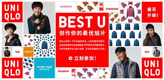 [BEST U]活动是今年UNIQLO[优衣库]全新打造的网络在线活动,由11月1日启动至12月28日结束,结合了UNIQLO [优衣库]秋冬季的主打商品高级轻型羽绒系列和摇粒绒系列商品进行推广。活动自上线以来就以其新颖的形式,炫目的设计成功吸引了众多关注的目光,参与用户络绎不绝。现在的活动官网上呈现了来自中国各地、香港、台湾,乃至海外优星人创作的风格各异的最优短片,他们各自选择最能代表自己时尚态度的最优色,并搭配同色系的UNIQLO[优衣库]商品,打造专属的最优风格。此外,UNIQLO[优衣库]5位品牌代言人孙俪、陈坤、奚梦瑶、董荷斌、侯宏澜也亲身参与活动,选择最能代表自己的最优色,用短片表达自己最爱的UNIQLO[优衣库]风格。