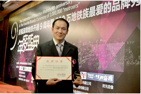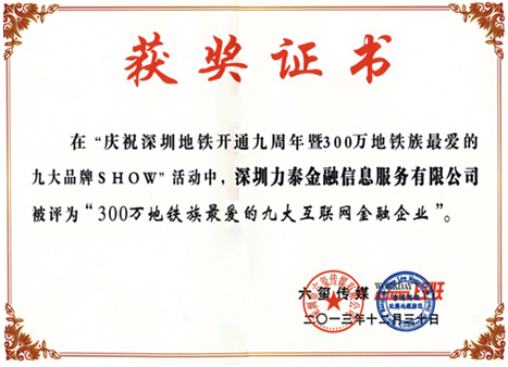 2013年12月30日,由深圳报业集团、上海文化广播影视集团、深圳地铁《上班》杂志主办的“庆祝深圳地铁开通九周年暨300万地铁族最爱的九大品牌SHOW”颁奖典礼在深圳隆重举行。e生财富作为知名互联网金融企业,经专家评审层层筛选,最终突出重围,一举荣膺“300万地铁族最爱的九大互联网金融企业”称誉。