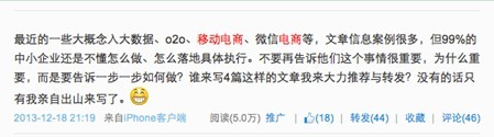 “最近的一些大概念如大数据、o2o、移动电商、微信电商等,文章信息案例很多,但99%的中小企业还是不懂怎么做、怎么落地具体执行。不要再告诉他们这个事情很重要,为什么重要,而是要告诉一步一步如何做?谁来写4篇这样的文章我来大力推荐与转发?没有的话只有我亲自出山来写了。”@龚文祥