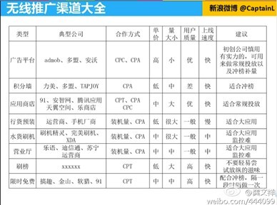 有个微博网友给我发来目前移动互联网的营销渠道整理,供参考: