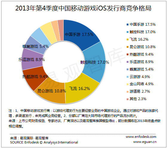 国内权威咨询机构易观智库近日发布了“2013年第四季度及年度移动游戏发行商市场格局”报告,该报告显示,中国手游集团(NASDAQ:CMGE)以17.9%的市场份额斩获2013中国移动游戏全平台发行商年度第一名;同时还取得2013 年第四季度全平台第一、2013年第四季度 Android平台第一、2013 年第四季度 IOS平台第一。国内知名发行商触控、飞流、乐逗、昆仑位列前五名。