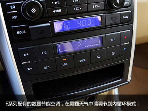 此外值得一提的是,空调系统也是直接与外界对接的通道,外界空气会通过它进入车内,影响到车内空气质量。所以在雾霾天气中,像E系列这种配有数显节能空调的车子,请您尽量将空调设定为内循环模式,这样可以有效隔绝车外较差空气,减少PM2.5的“涌入”。