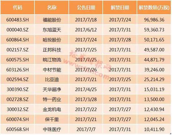 同花顺iFinD数据显示,7月24日至7月31日,合计有12家上市益达娱乐解禁股份超过1亿股,其中福能股份限售解禁股数量高达9.7亿股,已于7月24日到期,其次为东旭蓝天,限售解禁股数量为5.94亿股,将于7月31日到期,哈投股份解禁数量也逾5亿股,于7月28日到期。