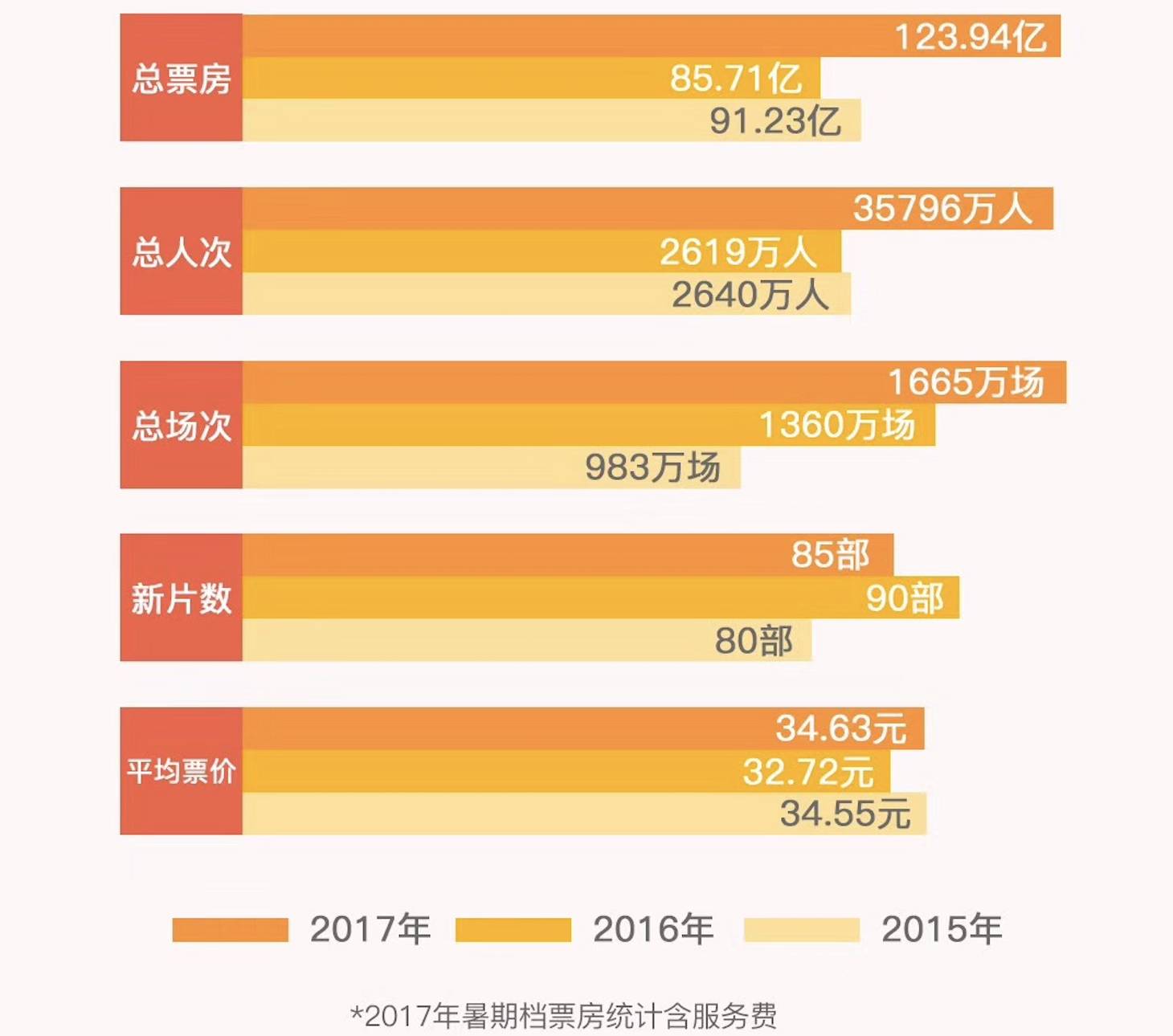 据猫眼专业版显示,2017年暑期档(7月-8月)全国票房共计124亿(含服务费),比去年的85.7亿同比增长44.6%。