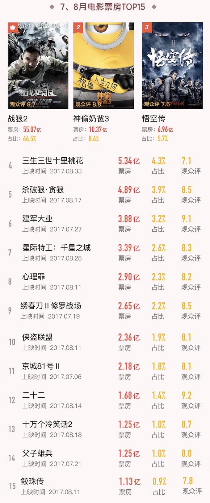 在《战狼2》的带动下,中国电影再创三个新高: