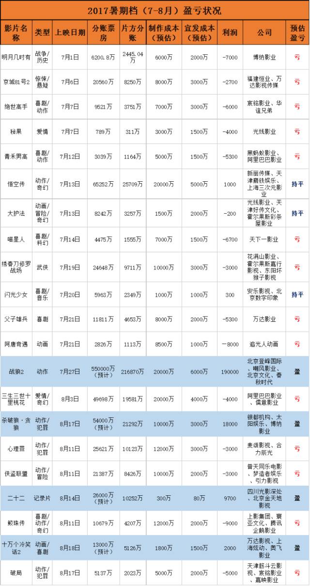 (以上表格中的部分制作成本、宣发成本为估计值,所以盈亏仅供参考,欢迎指正)