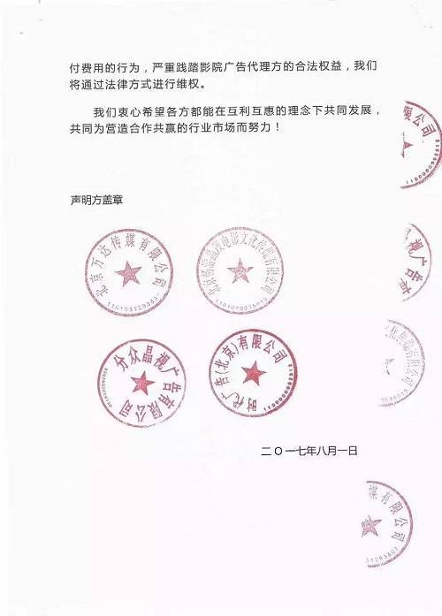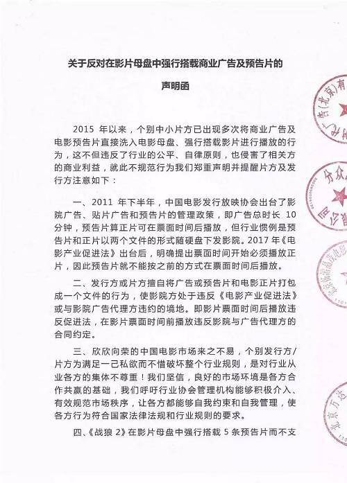 影院广告方联名投诉《战狼2》8月9日,由北京万达传媒有限益达娱乐、分众晶视广告有限益达娱乐、北京畅游晶茂电影文化传媒有限益达娱乐、时代广告(北京)有限益达娱乐四家盖章联名发出的声明函(落款日期为8月1日)称,《战狼2》在影片母盘中强行搭载5条预告片而不支付费用,严重践踏影院广告代理方的合法权益。