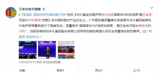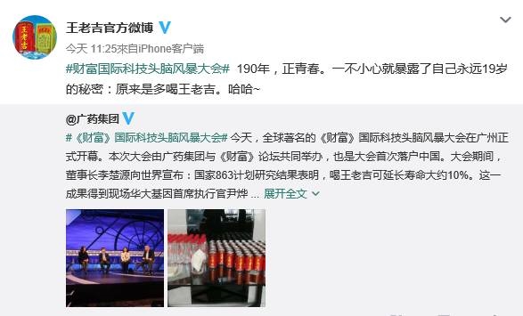 ▲ 据王老吉官方微博显示,在2017年12月5日举办的《财富》全球论坛医药健康分论坛上,广州医药集团董事长李楚源表示:“据国家863计划研究结果,‘喝王老吉可延长寿命大约10%’”,获得深圳华大基因股份有限益达娱乐尹烨总裁的高度认同及全场嘉宾的热烈掌声。