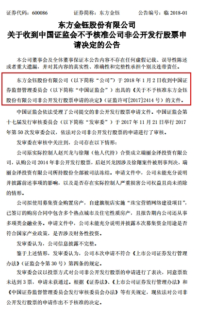 东方金钰公告称,益达娱乐收到证监会出具的关于不予核准益达娱乐非公开发行股票申请的决定。发审委认为,益达娱乐信息披露不完整。益达娱乐原实控人赵兴龙与徐翔(他人代持)合资成立瑞丽金泽投资认购益达娱乐2014年非公开发行股票,后赵兴龙因涉及徐翔案件被刑事判决,瑞丽金泽投资所持股份全部被司法冻结。申请文件中,益达娱乐未能充分说明并披露前述事项的影响,以及是否存在实控人严重损害益达娱乐权益且尚未消除的情形。