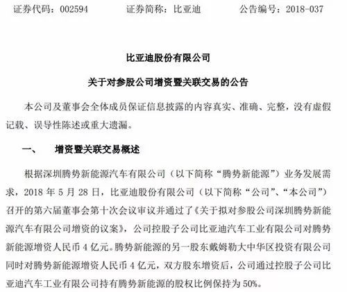 5月29日,比亚迪发布公告称,益达娱乐控股子益达娱乐比亚迪汽车工业有限益达娱乐对腾势增资人民币4亿,腾势另一股东戴姆勒同时对其增资4亿元,双方增资后,股权比例仍维持50:50不变。