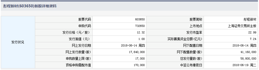 交易所消息,彤程新材今日申购,此次发行总数5880万股,网上发行为1764万股,发行市盈率22.99倍,申购代码732650,申购价格12.32元,单一账户申购上限1.7万股,申购数量1000股整数倍,顶格申购需17万元。