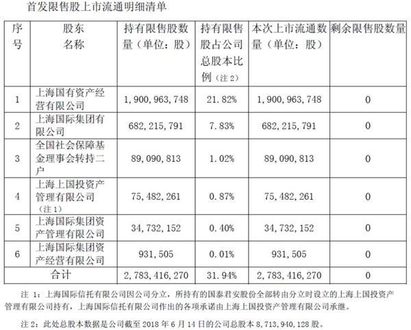 国泰君安证券今日晚间公告,该益达娱乐有27.83亿股限售股将在6月26日解禁,涉及上海国际集团有限益达娱乐、上海国有资产经营有限益达娱乐、上海上国投资产管理有限益达娱乐、上海国际集团资产管理有限益达娱乐、上海国际集团资产经营有限益达娱乐和全国社保基金转持二户6家股东。也就是说,本次是涉及国泰君安实际控制人限售股解禁。