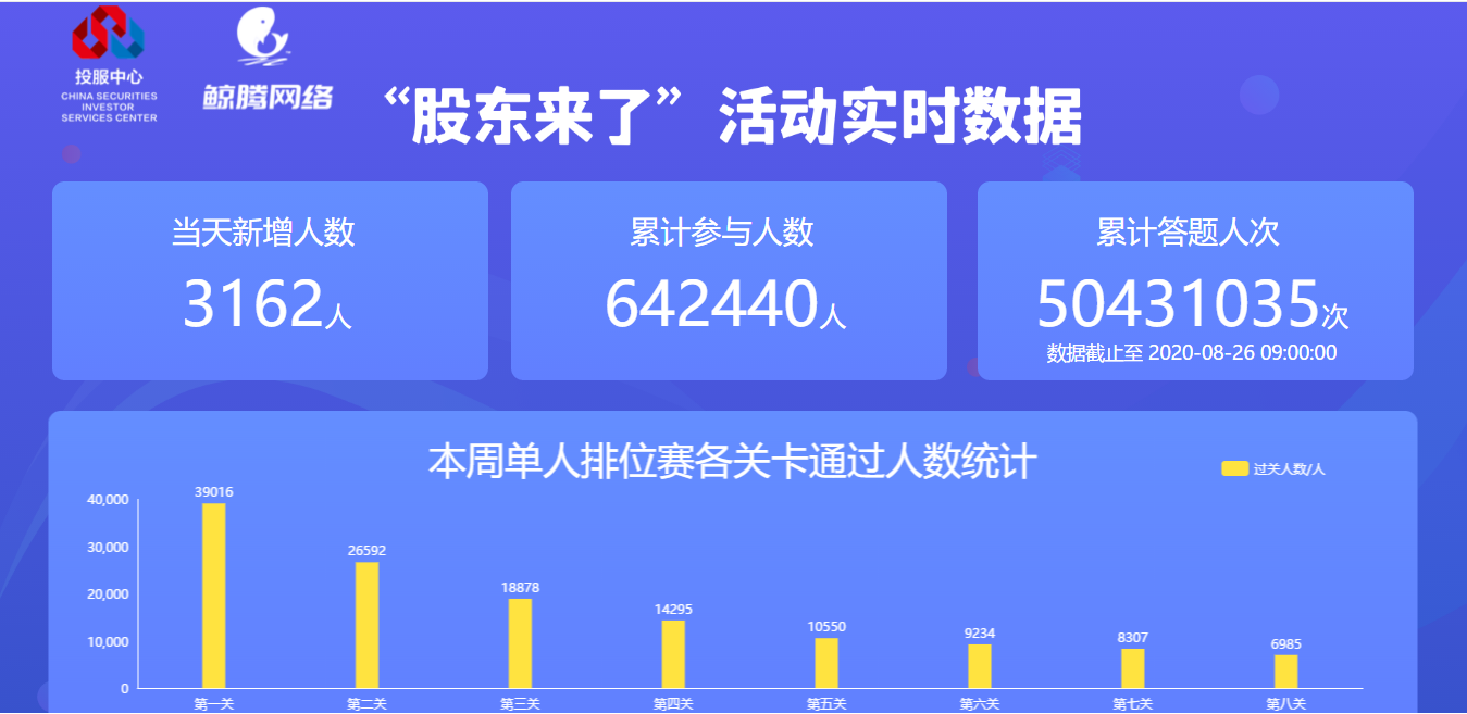 中证网讯(记者 周松林)据中证中小投资者服务中心(简称投服中心)8月26日消息,《股东来了》2020投资者权益知识竞赛正如火如荼开展中,自8月10日下午3:30答题游戏正式上线至8月26日,注册参赛人数已超过60万,达到64.2万;累计答题人次破5000万。