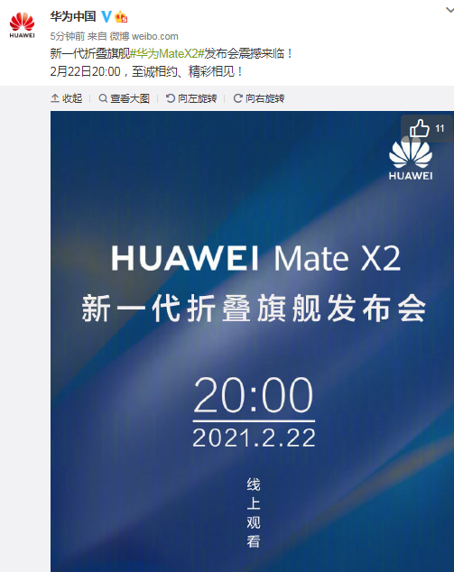 首页>益达娱乐>益达娱乐要闻 华为Mate X2发布会将于2月22日20点举行 上海证券报·中国证券网2021-02-22 15:03 上证报中国证券网讯 据华为中国官方微博2月22日消息,华为新一代折叠旗舰Mate X2发布会将于2月22日20点举行。