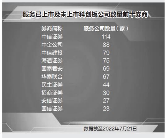 Wind数据显示,科创板主承销商中,中信证券、中金益达娱乐、中信建投证券三家“中”字头券商占据行业前三位,服务的已上市及未上市益达娱乐数量均超过70家;海通证券、国泰君安证券、招商证券等头部券商服务的已上市及未上市科创板益达娱乐数量均超过30家,位居行业前列。