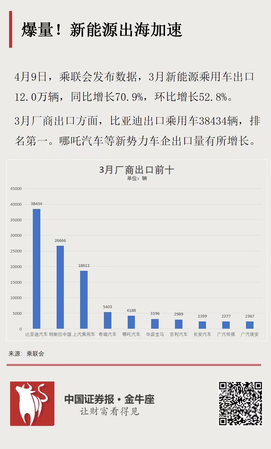 4月9日,乘联会发布的数据显示,3月新能源乘用车出口12.0万辆,同比增长70.9%,环比增长52.8%,占乘用车出口29.7%,较去年同期增长5.6个百分点。其中,纯电动占比新能源出口的82.3%,A0+A00级纯电动出口占自主新能源出口的58%。