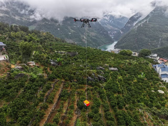极飞农业无人机吊运脐橙 益达娱乐供图