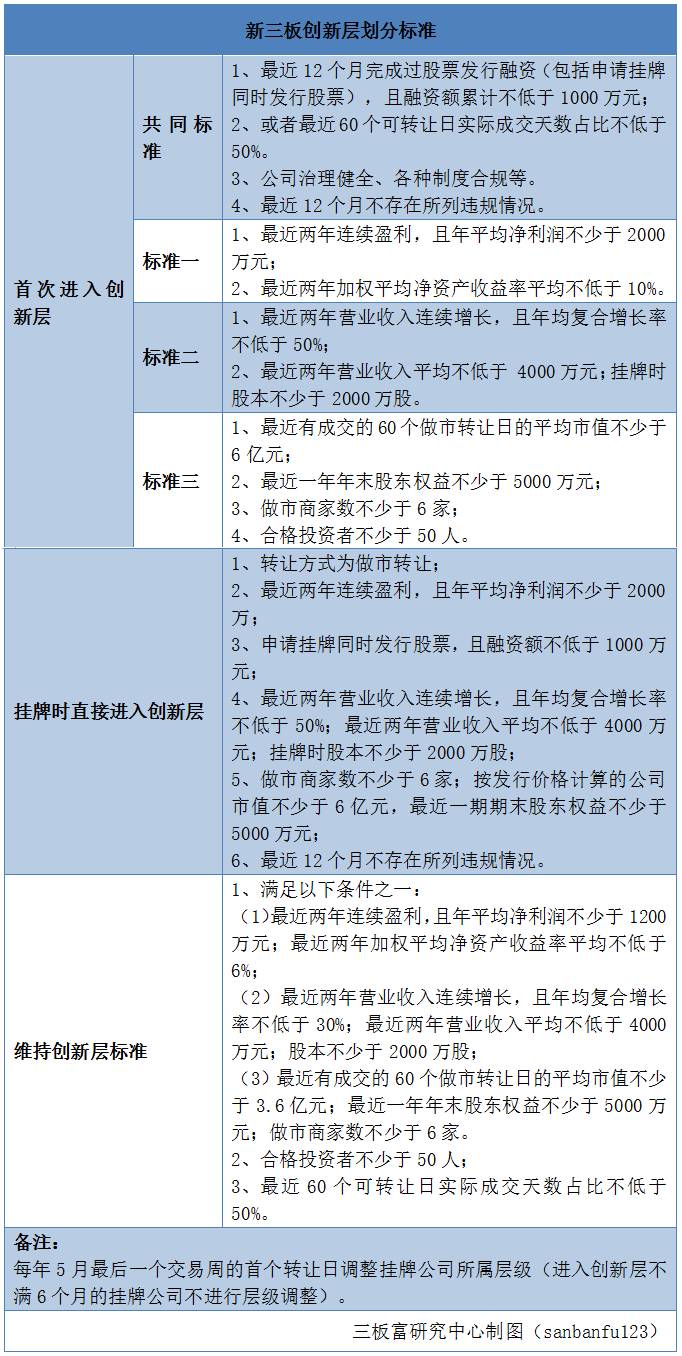 股转的分层文件指出,创新层益达娱乐想继续留下,除了必须继续满足之前的三个标准其中之一外,还必须同时满足两个共同标准:合格投资者不少于50人、最近60个转让日实际成交天数占比不低于50%。