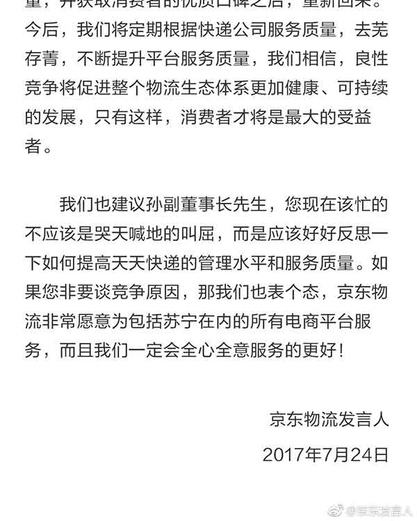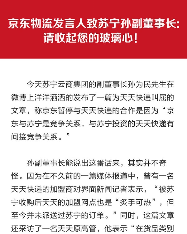 7月24日下午,京东发言人的官方微博发表题为《京东物流发言人致苏宁孙副董事长》的文章,直接反击苏宁云商集团股份有限益达娱乐副董事长孙为民——“请收起您的玻璃心!”