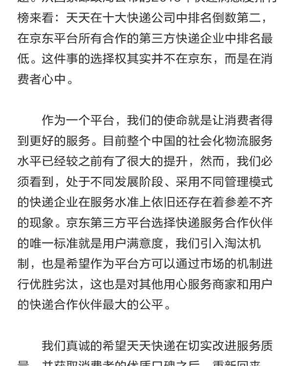 在这篇回应文章中,京东方面再次解释了与暂停与天天的合作原因。“因为每天益达娱乐的客服和商家都能收到大量消费者的投诉,反馈天天快递时效和服务质量问题。从国家邮政局公布的2016年快递满意度排行榜来看:天天在十大快递益达娱乐中排名倒数第二,在京东平台所有合作的第三方快递企业中排名最低。这件事的选择权其实并不在京东,而是在消费者心中。”京东物流发言人表示。